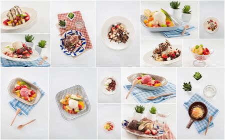 Large collection of Ice cream, delicious gelati with fresh pistachio, chocolate, caramel, melon, mango, chocolate chip sandwich cookies with aromatic vanilla pod. Long banner format.
