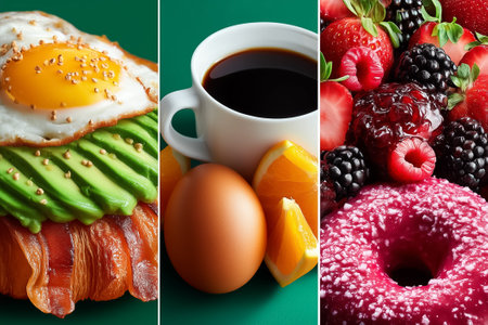 Bright modern collage showcasing breakfast closeups with eggs, coffee, and vibrant fruits. Culinary setting with vivid colors and textures. Concept of dining, food service, hospitality.