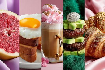 Closeup collage of diverse breakfast foods including vibrant grapefruit, sunny-side-up egg, frothy coffee, and sweet pastry. Bold pink and green backdrop enhances visual appeal.