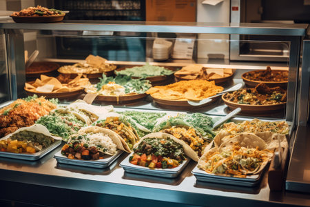 taco shop with variety of exotic tacos, burritos and nachos on display, created with generative ai