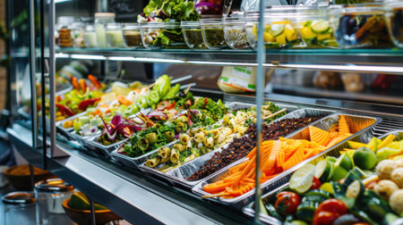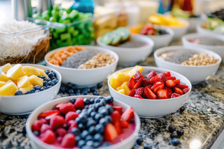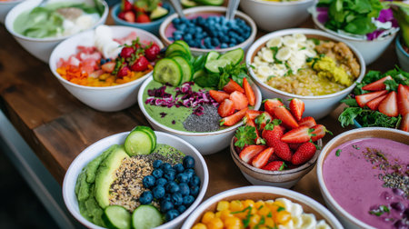 Vibrant image showcasing a variety of fresh smoothie bowls and salads at a trendy juice bar