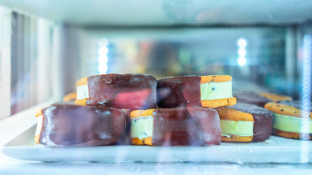 Selection of frozen pistachio and chocolate sandwich icecream in the fridge on display at the cafe in Positano town, Amalfi coast, Italy