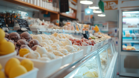 Colorful variety of ice cream flavors displayed in a bustling shop during a warm summer afternoon