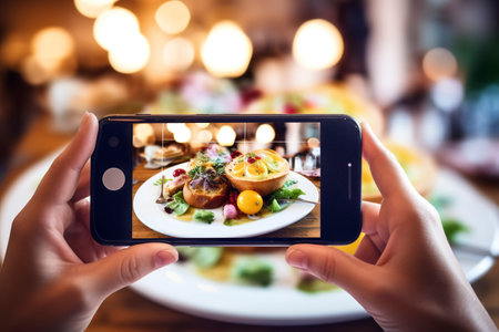 Taking photo with smart phone of food in restaurant, take photo with mobile phone.