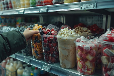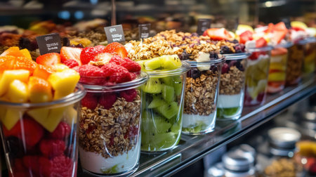 An array of vibrant fruits in clear cups displayed on dark shelving, highlighting red strawberries. Emphasizes a wholesome and inviting selection. High quality photo