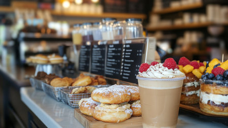 Delicious pastries and coffee displayed in a cozy cafe during morning hours