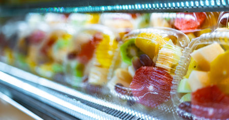 Plastic boxes with fresh fruits displayed in a commercial refrigerator. Fruit salad