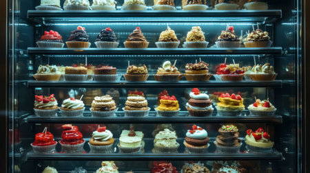 Brightly lit display case filled with an array of beautifully decorated cupcakes, showcasing various flavors and enticing toppings, perfect for any sweet lover.