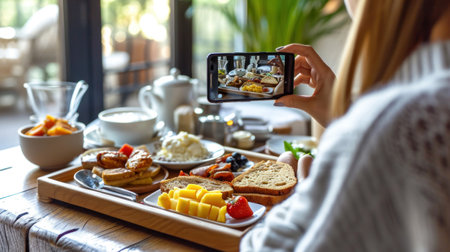 Woman taking photo of continental breakfast on wooden tray with smartphone