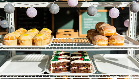 Bright bakery display with assorted lemon muffins, glazed doughnuts, and festive fruitcake slices under decorative string lights.