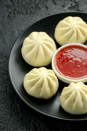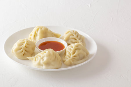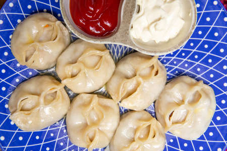 Closeup on traditional Central Asian steamed dumplings manty with red sauce