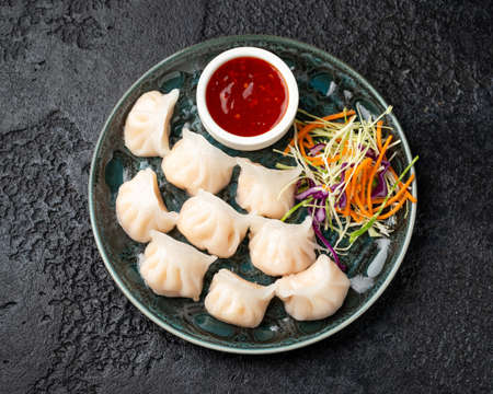 Traditional Nepalese food calls Momos. Steamed cooked momos with sauce.