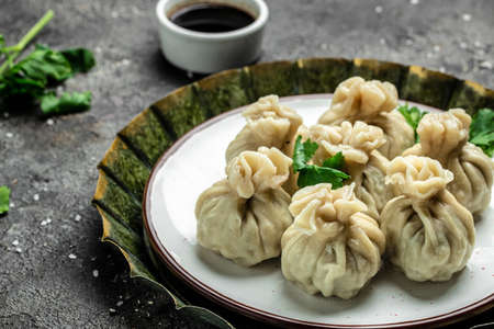 Home made traditional dumpling momos food of Nepal served on a plate with special Momo Sauce. Selective focus