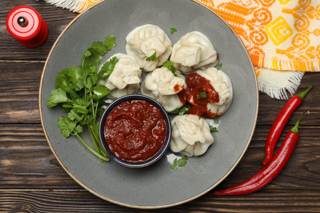 khinkali with tomato sauce, herbs on a dark wooden background top view, dumplings