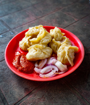 Hot Momos Served with Spicy Red Chutney on a Roadside Stall in Dehradun, India