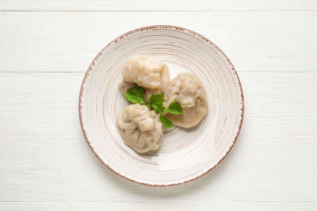 Plate with tasty dumplings on light wooden background