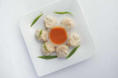 Momo , type of South Asian dumpling; native to Tibet, Nepal, Bhutan and Sikkim. It is similar to Chinese baozi and jiaozi, Mongolian buuz, Japanese gyoza and Korean mandu. White background.