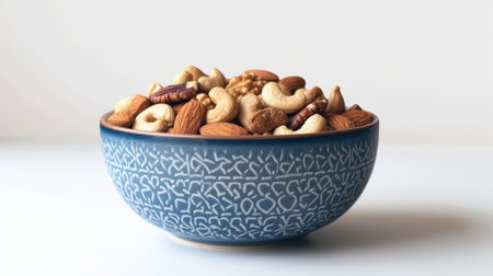 An inviting display of assorted nuts including almonds, cashews, walnuts, and pecans in a ceramic bowl positioned on a clean white background, perfect for healthy snack ideas.