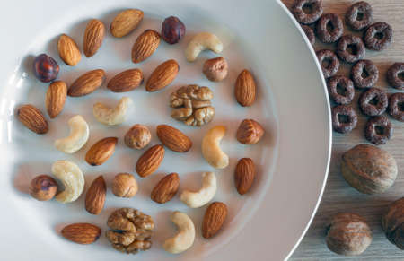 Almonds, Hazelnuts, Walnuts, Cashew Nuts on a White Plate, Three Whole Walnuts, Crunchy Whole Grain cereals round oats on Light Wooden Table. Healthy Organic Snack, Breakfast, Food Ingredients.