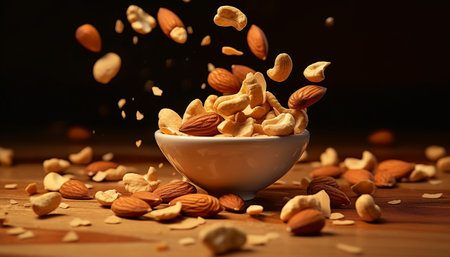 AI Generated. Mixed nuts bowl displayed on wooden table gourmet snack presentation natural light