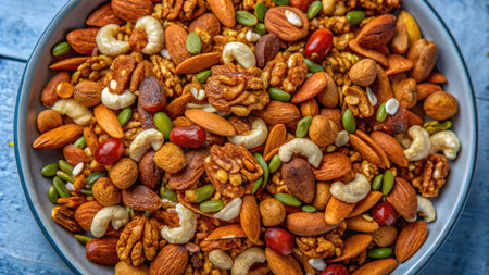 This image showcases a vibrant collection of assorted nuts in a bowl, perfect for healthy snack ideas, nutrition discussions, or culinary presentations.