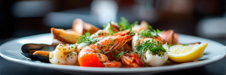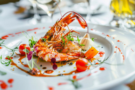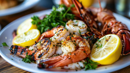 A vibrant plate of grilled shrimp and lobster garnished with fresh herbs and lemon slices, perfect for seafood lovers and culinary enthusiasts, showcasing delicious gourmet dining.