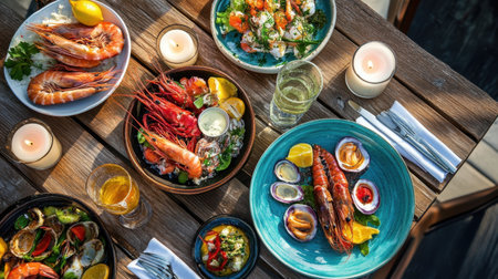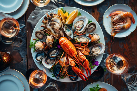 Seafood platter with wine glasses in a restaurant setting. Top view of luxury dinner on the wooden table. Generative AI
