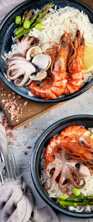 Shrimps with rice on light gray background. Mediterranean diet concept. Flat lay, top view, copy space