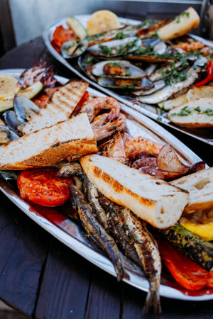 Grilled seafood feast with fresh bread and vegetables served on a platter for outdoor dining