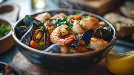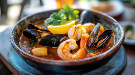 A vibrant seafood stew featuring shrimp and mussels, garnished with fresh herbs and a slice of lemon, served in a rustic bowl. Perfect for culinary inspiration.