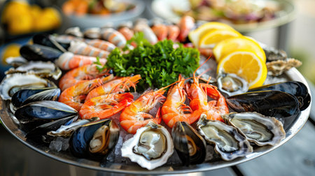 A vibrant seafood platter showcasing fresh shrimp, mussels, and clams, garnished with lemon and herbs, ideal for gatherings or special occasions.