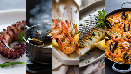 A vibrant seafood platter showcases grilled octopus, succulent shrimp, and a colorful paella dish, garnished with fresh herbs and lemon slices, highlighting culinary artistry and flavors