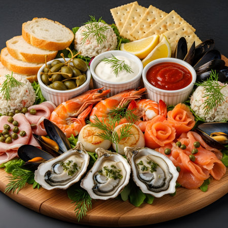 Discover an elegant cicchetti platter featuring a variety of seafood, dips, and fresh bread, perfect for sharing at gatherings or special occasions.