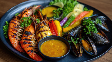 A vibrant assortment of grilled seafood and fresh vegetables is presented on a dark plate. The image features grilled shrimp and mussels alongside colorful bell peppers, carrots, and lettuce. The dish is accompanied by a small bowl of sauce. This image is suitable for use in food-related publications or promotional materials.