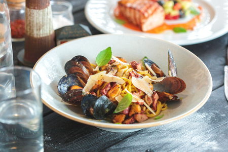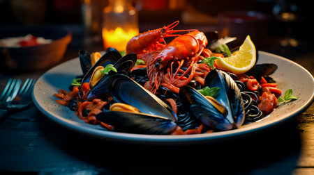 Plate of black spaghetti with prawn, mussels. Healthy food concept.