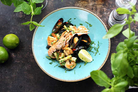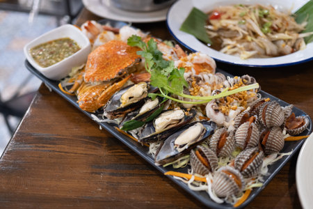 seafood plate with shrimp shellfish crab squid cockle spotted babylon with seafood sauce chili lemon lime serve on dining table, shrimps prawns seafood buffet menu cooked food