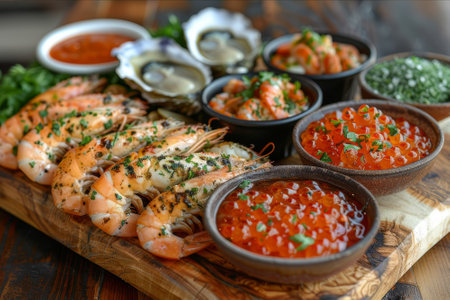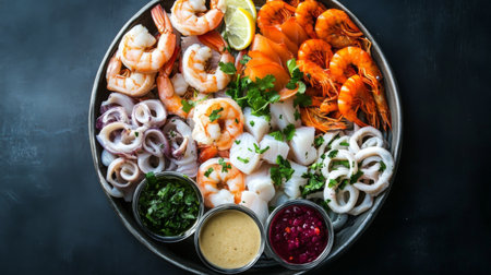 A captivating seafood platter showcasing an array of fresh shrimp, scallops, and squid, garnished with herbs and served with vibrant sauces.