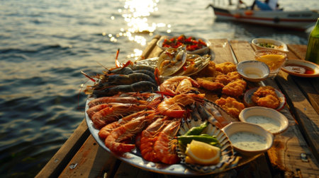 The sea meets the table as a seafood platter filled with an assortment of grilled and fried delights is sad on a peaceful dock by the shore