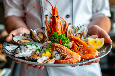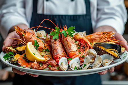 A chef is holding a plate of seafood, including shrimp, mussels, and lemon slices. The plate is white and the seafood is arranged in a visually appealing manner. The chef's white uniform