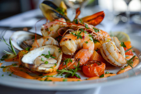 A close-up of a chef's special seafood dish. The plate is a canvas, with the seafood and accompanying garnishes creating a beautiful, appetizing picture