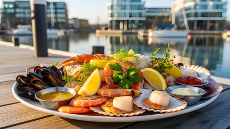 A lavish seafood platter featuring crab, scallops, shrimp, and mussels served on a sunny outdoor table by a marina. The blurred background of yachts and modern buildings sets a scene of upscale waterfront dining.