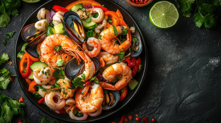 Top view of a spicy seafood salad with shrimp, squid, and mussels, mixed with fresh vegetables and a spicy lime dressing.