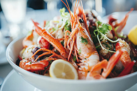 A vibrant seafood salad featuring shrimp, mussels, and fresh greens, garnished with lemon. Ideal for gourmet dining or healthy meal options.