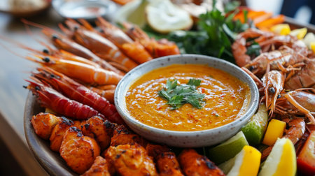 A vibrant seafood platter featuring fresh shrimp and shellfish served with a delicious dipping sauce. Perfect for gatherings and culinary experiences.
