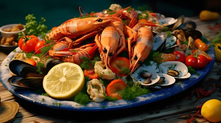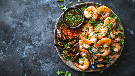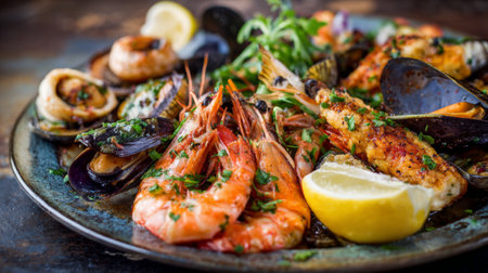 A vibrant seafood platter featuring succulent shrimp, mussels, and flavorful fish. Garnished with fresh herbs and lemon, it enhances any gourmet experience.