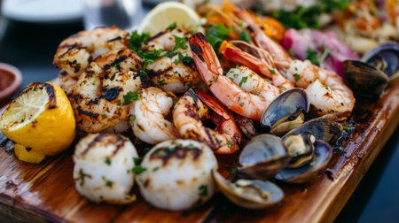 A vibrant grilled seafood platter featuring shrimp, scallops, and clams, garnished with fresh lemon and herbs, perfect for any summer gathering or feast.