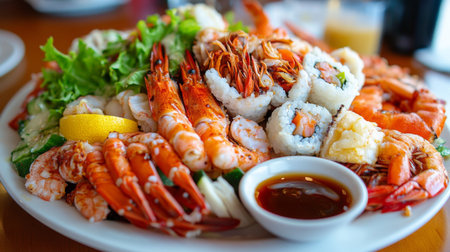 A vibrant seafood platter showcases an assortment of shrimp, sushi, and garnishes, perfect for sharing and indulging in a fresh culinary delight.