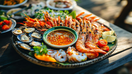 Close up of delicious grilled seafood platter.Tray of mussel, shrimp,prawns and clams with spicy and sour dipping sauce that is packed full of Thai seafood flavor.