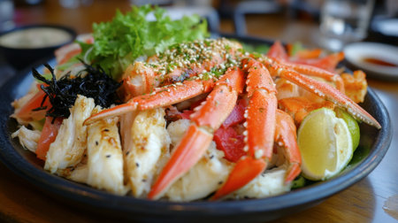 A vibrant seafood platter featuring crab, fish, and fresh vegetables, garnished with herbs and lime, perfect for a delicious meal and culinary experience.