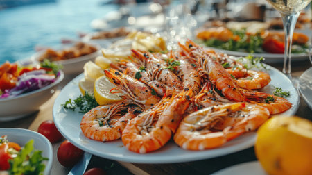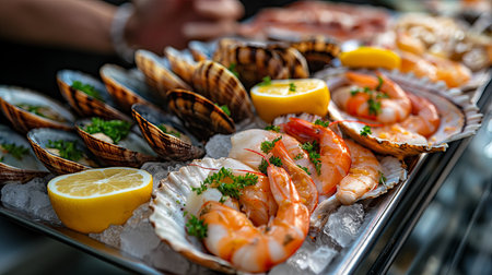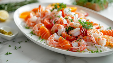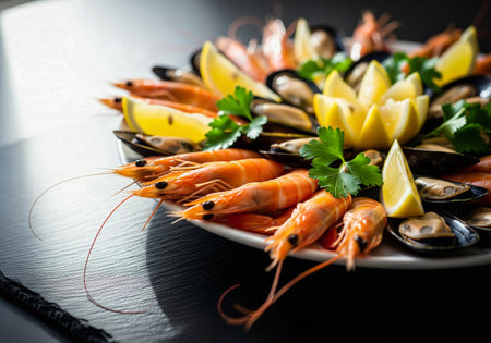 Vibrant seafood platter featuring shrimp, crustaceans, and herbs, ideal for gourmet meals. Perfect for restaurants, picnics, or special occasions.